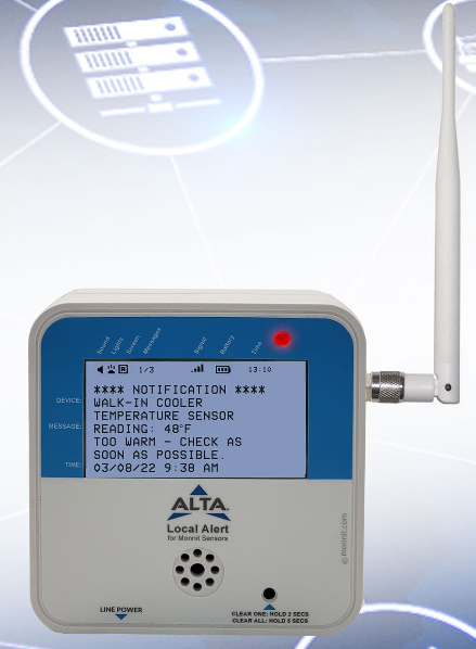 The ALTA Wireless Local Alert provides three ways to notify people about critical changes and sensor readings from your Monnit IoT network. The Local Alert flashes a red LED, sounds an audible alarm, and displays the important message upon receiving a notification. The Local Alert can also display sensor readings from any sensor on the same account.